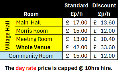 Scroll down or jump to the relevant sections: Hire Rates / Village Hall / Community Room